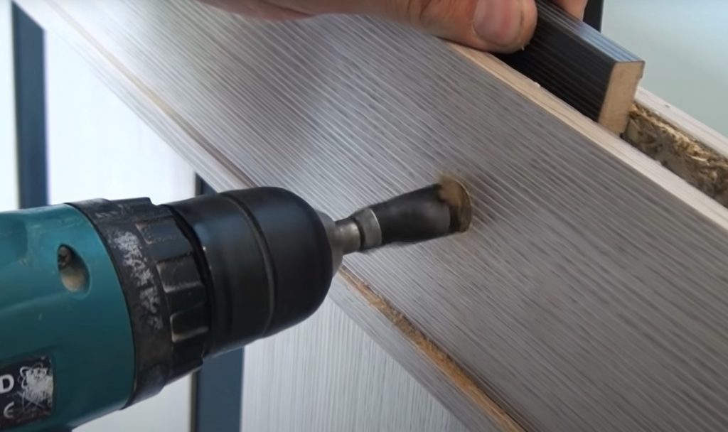 Теперь карандашом намечаем центр отверстия. С другой стороны двери поступаем аналогично и сверлим отверстия с двух сторон.