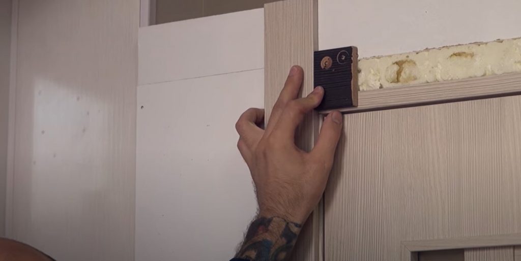 Устанавливаем добор в дверной проем и расклиниваем его.